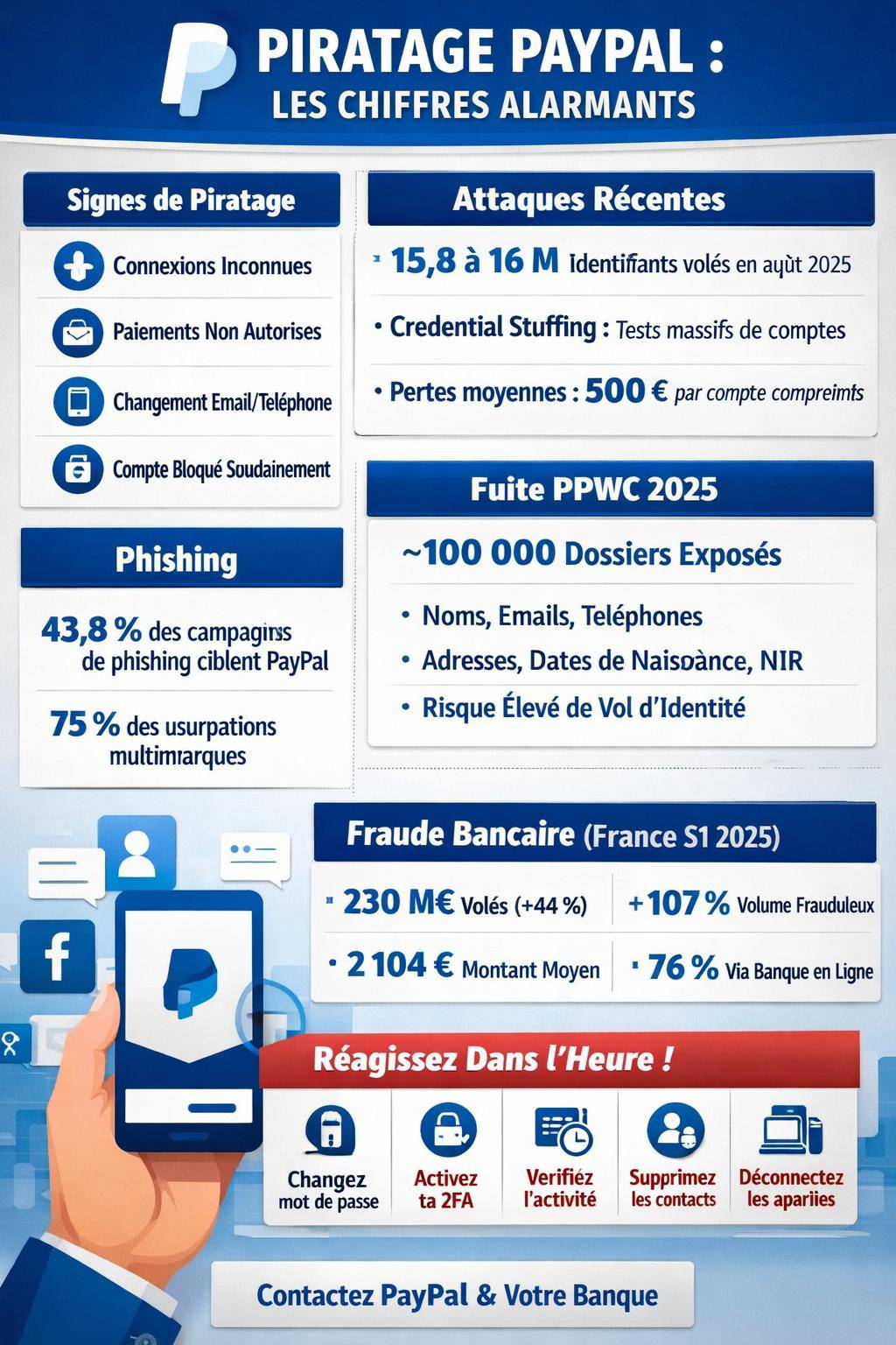 Un compte PayPal piraté ne se résume jamais à un simple mot de passe volé. Entre vols d’identifiants massifs, attaques par credential stuffing, arnaques par phishing et détournement de virements, chaque minute compte pour limiter les dégâts et reprendre le contrôle.