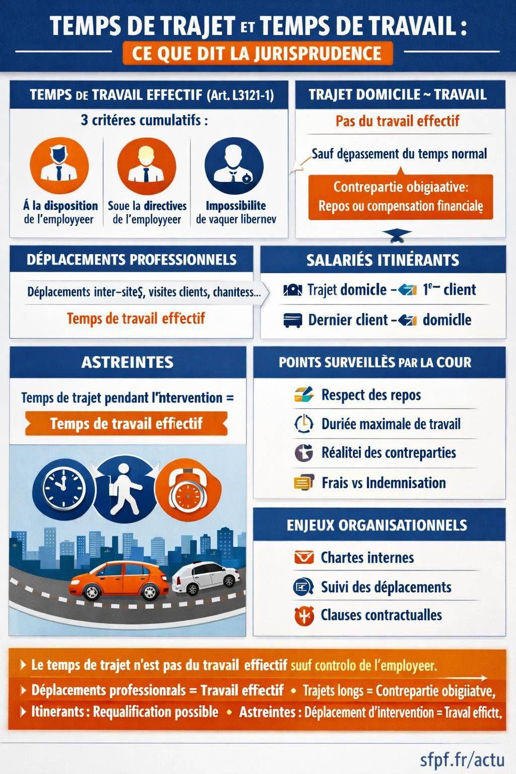 Pour une mise en perspective plus globale de ces enjeux, la page dédiée au temps de trajet et temps de travail constitue un complément utile, notamment pour relier les règles de déplacement au reste du droit du temps de travail.