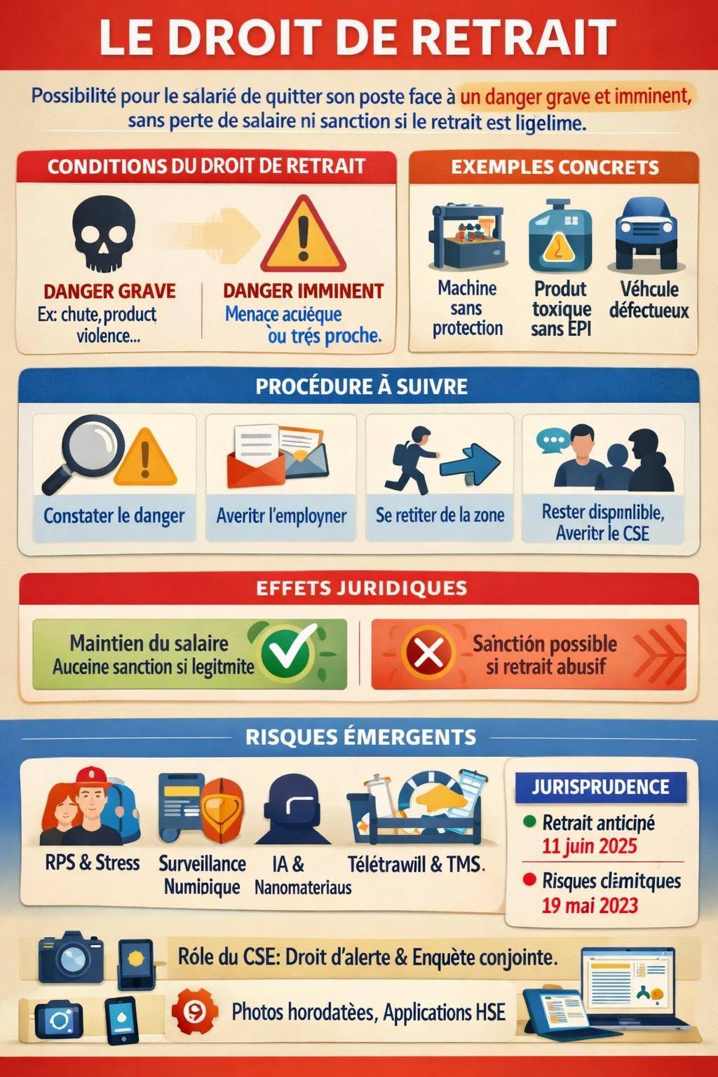 | Protection du salarié | Aucune sanction ni retenue de salaire ne peut être appliquée si le retrait est justifié. |