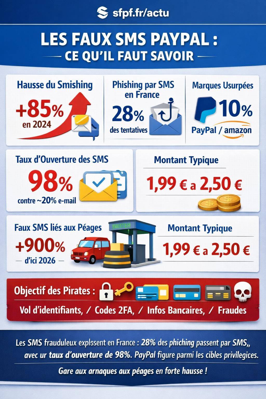 Les fausses alertes de péage ou de service automatique s’intègrent désormais dans les campagnes ciblant PayPal. En toile de fond, une hausse des fraudes par SMS sur les péages est observée, avec une augmentation annoncée de l’ordre de 900 % d’ici 2026.