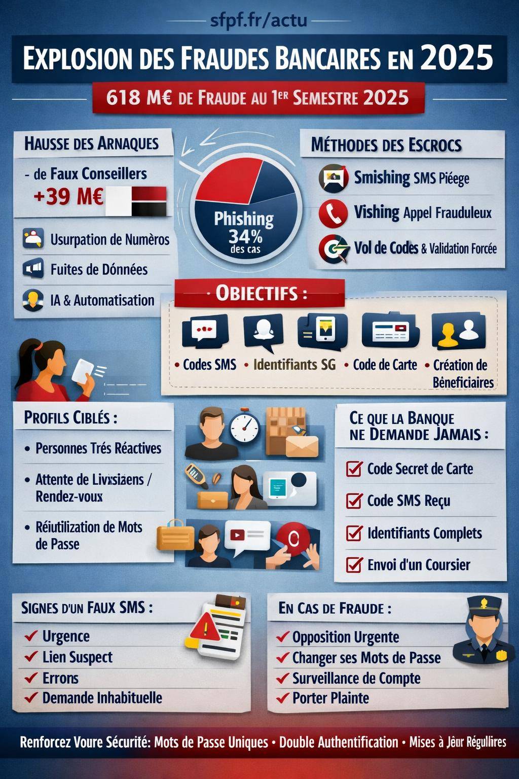| Vishing | Appel téléphonique (souvent avec spoofing) | Obtenir des codes ou validation d’opérations | « Service anti-fraude », « police », « support technique » |