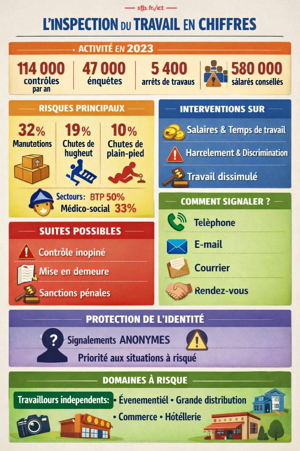| Inspection du travail | Contrôler l’application du Code du travail, sanctionner les infractions, orienter | Horaires illégaux, sécurité défaillante, travail dissimulé, harcèlement, recours abusif aux indépendants |