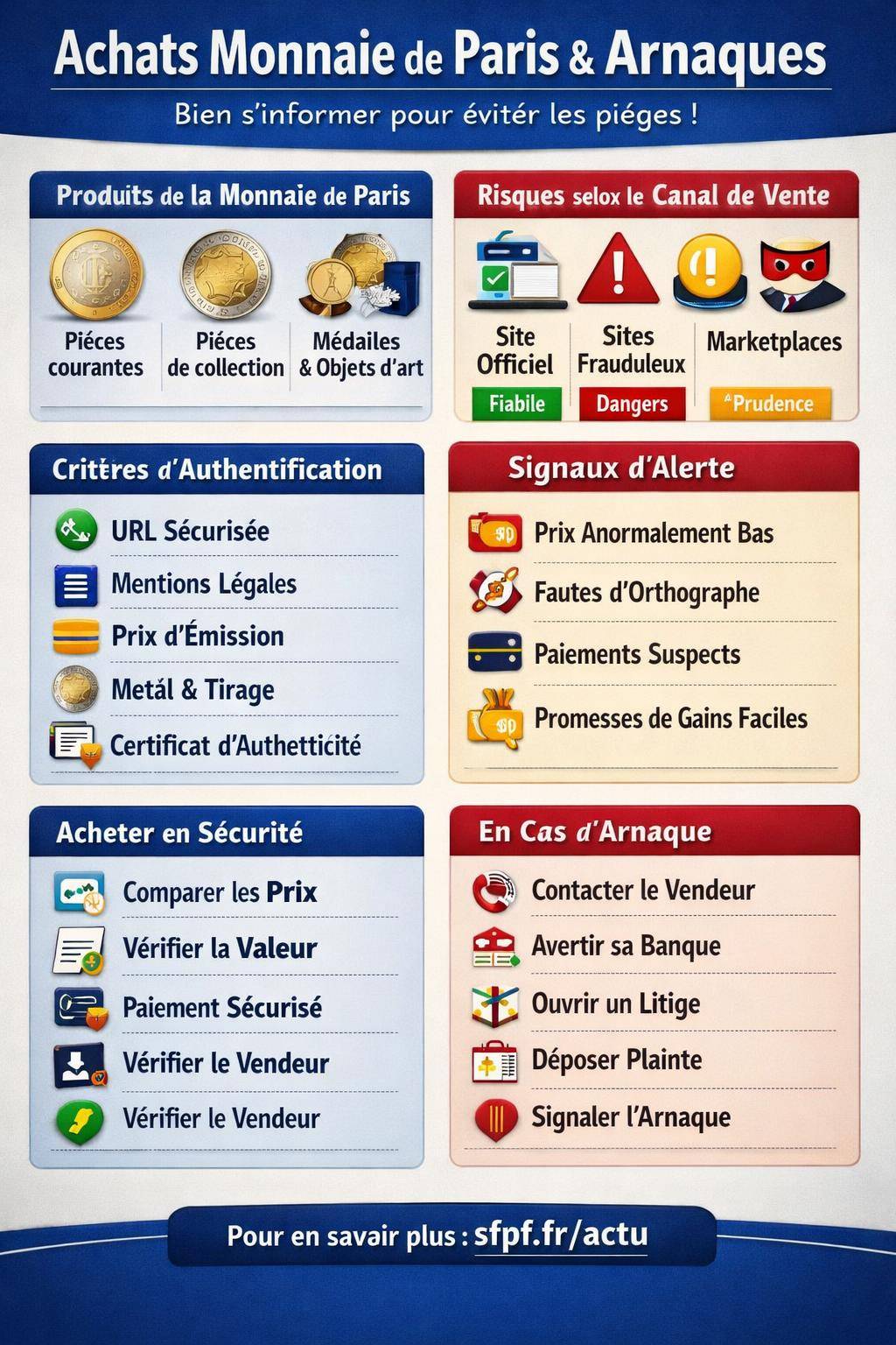 | Arnaques fréquentes | Méfiez‑vous des sites imitant la Monnaie de Paris, prix trop attractifs ou moyens de paiement inhabituels. |