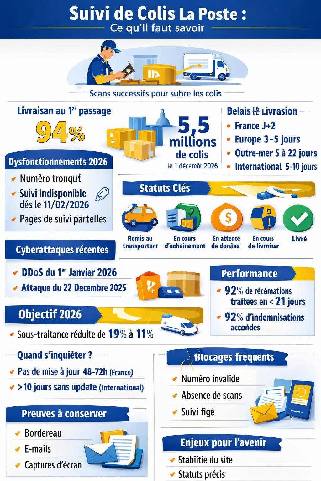 Les données disponibles indiquent par exemple un taux de livraison au premier passage de 94 % et un volume de colis en hausse de 6 % sur les périodes de pointe d’ici 2026, avec un pic estimé à 5,5 millions de colis le 1er décembre. Ces chiffres expliquent la sensibilité du suivi en ligne à la moindre surcharge ou attaque informatique.